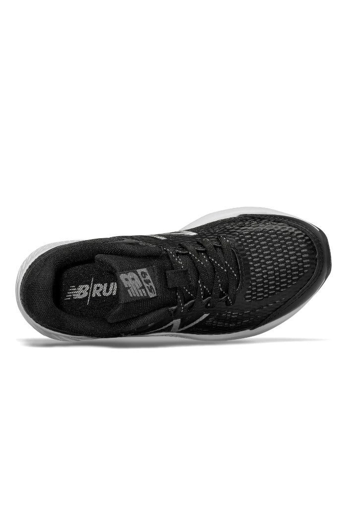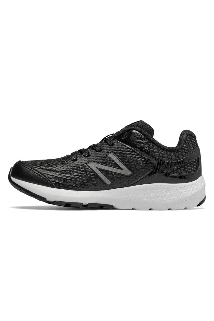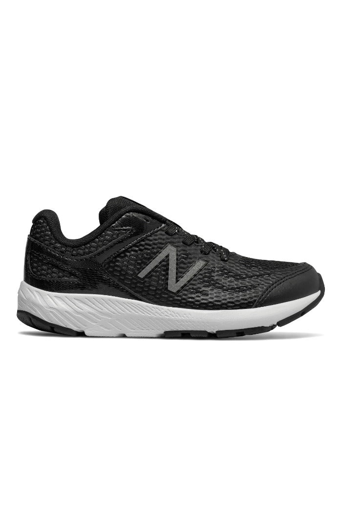The New Balance KJ519BGY Boys' Running Shoe is a lightweight lace-up sneaker with a breathable black mesh upper, tonal "N" logo and a cushioned white midsole. New Balance designed it for everyday play and short runs with a durable rubber outsole and a padded collar for added comfort. A low-profile silhouette and secure lace closure keep the fit stable for active kids.